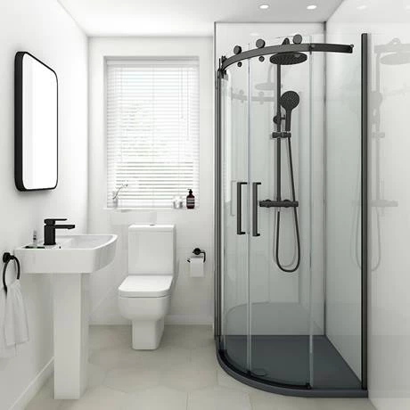 Make a statement in a compact bathroom with this Arezzo Frameless Quadrant Shower Enclosure. It measures 800mm wide to fit snugly into a corner of your bathroom, with a sweeping curved side that maximises space in the room. Striking matt black lines stand out against the glass, which is toughened for your peace of mind. This Arezzo shower enclosure has an exposed brass roller to allow doors to slide back and forth smoothly. You can further enhance the contemporary style by lining the area with Rhodes White Gloss Marble Effect Wall Tiles.
